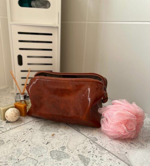 This cosmetic bag is made from high-quality leather. It's roomy enough to fit all of your daily essentials, including a shampoo bottle. It also has an inside pocket for extra storage and a wide frame opening for easy access.